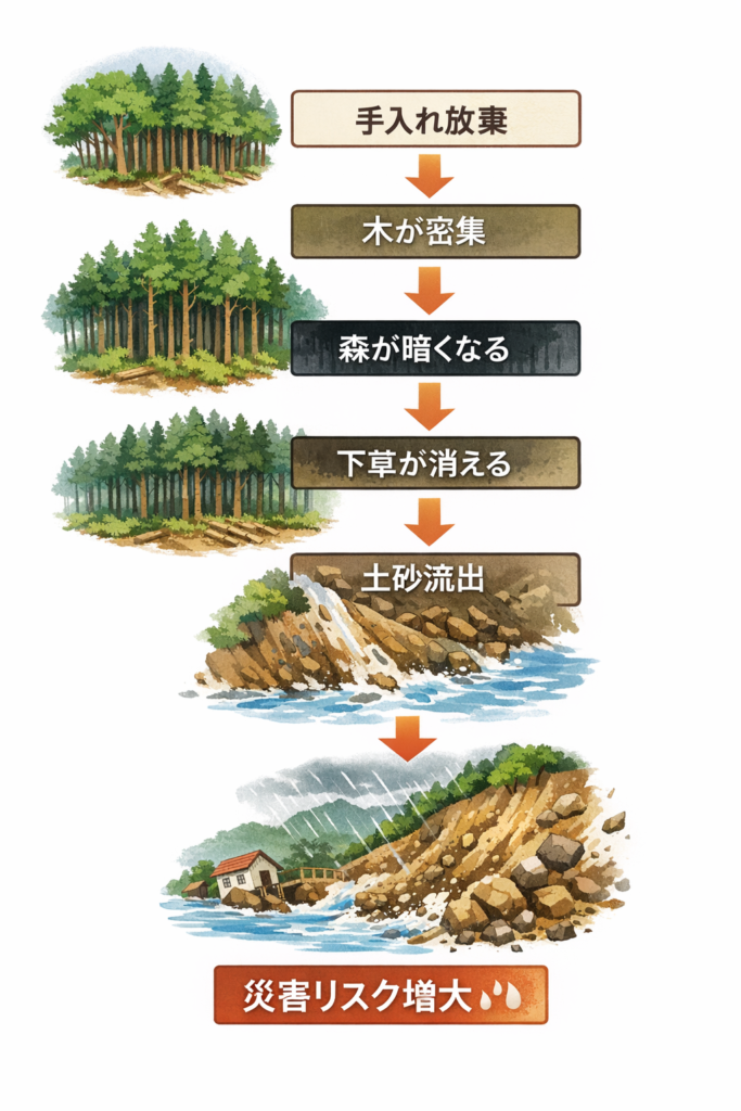 森林は本来、土砂災害を防ぐ役割を持っていますが、手入れされていない森林ではその機能が十分に発揮されません。