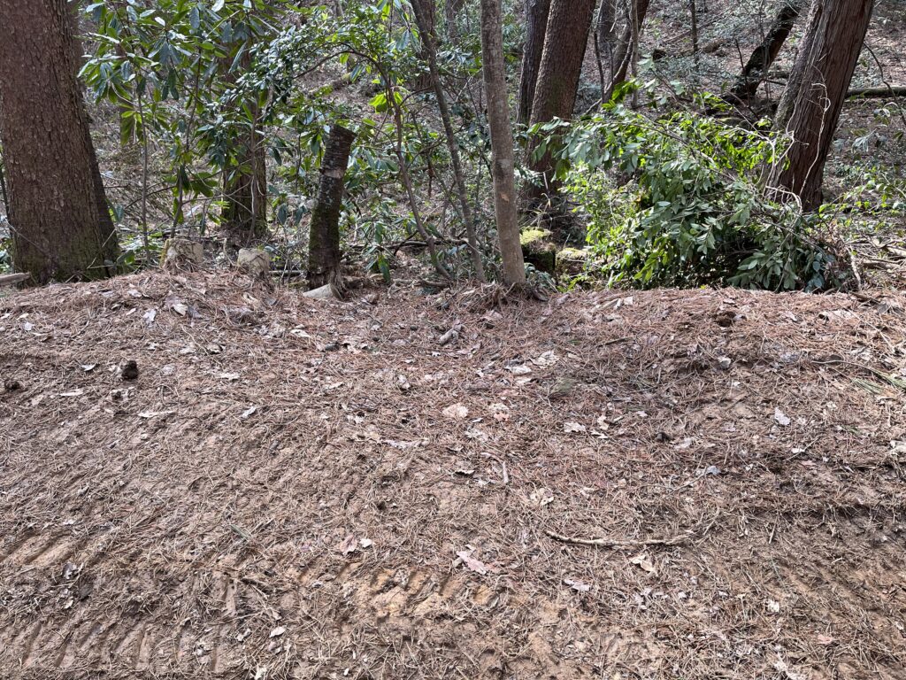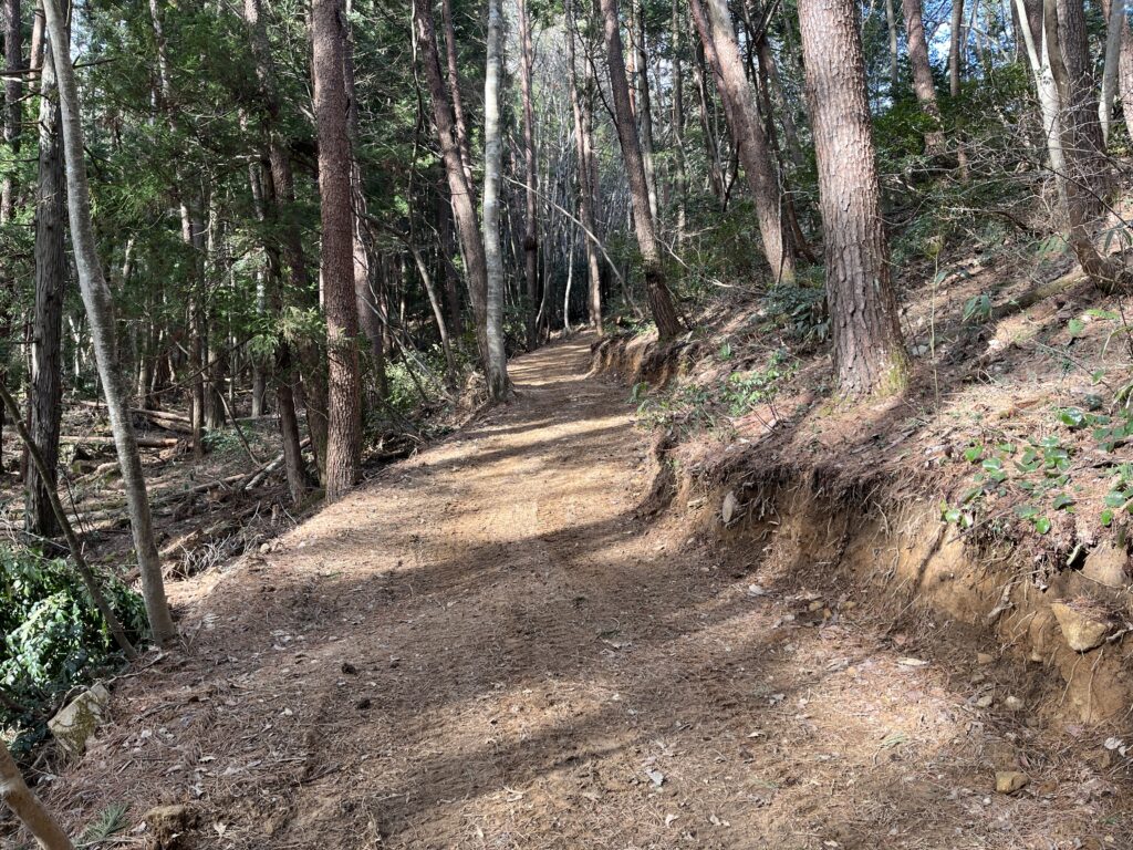 山の形に沿った、地形に逆らわない作業道の状況です。